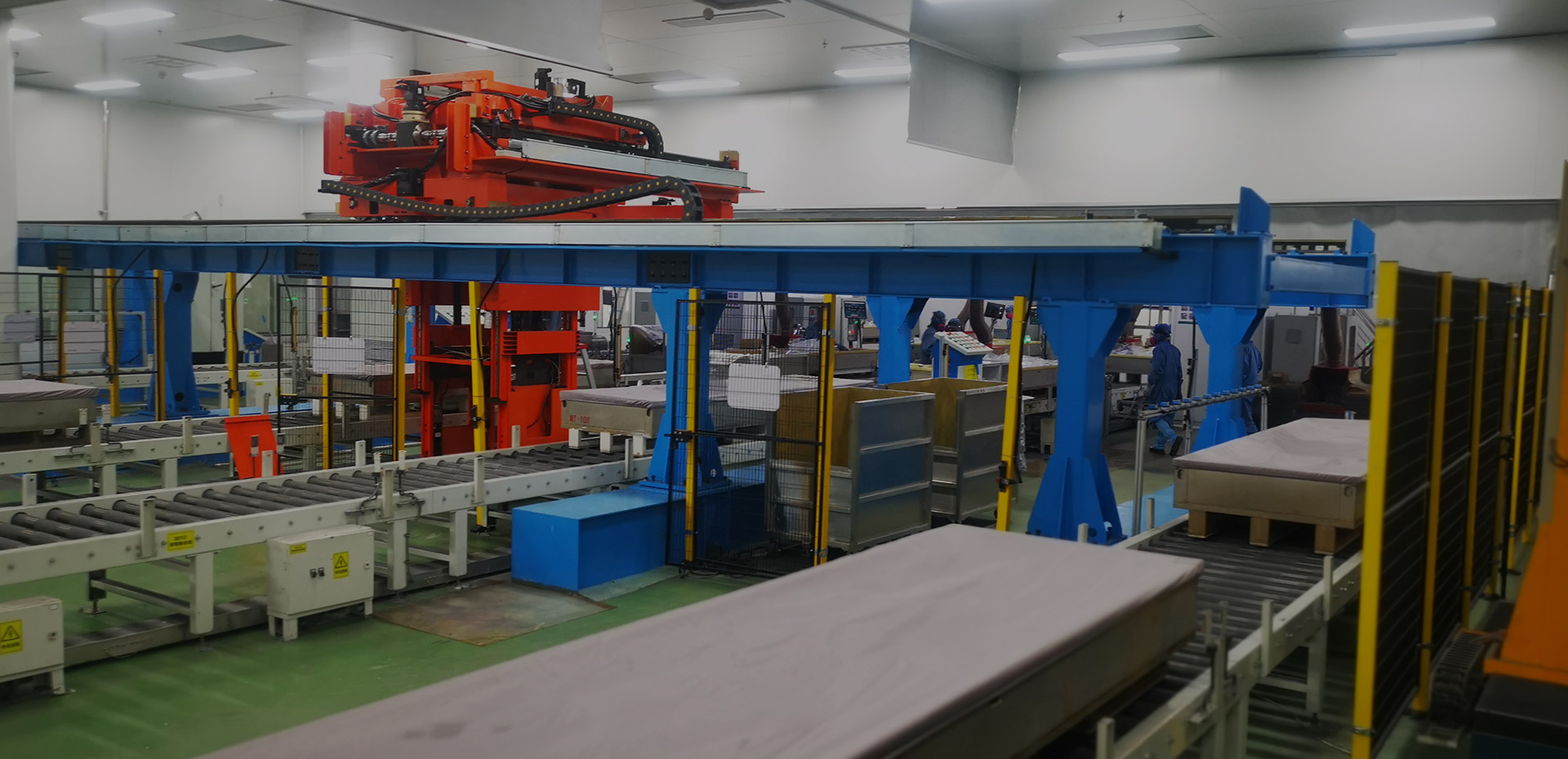 高剛性的桁架機(jī)械人結(jié)構(gòu),基于三面滾輪式滑塊-導(dǎo)軌副的高剛性的運(yùn)動(dòng)副,采用重載形式的橫梁結(jié)構(gòu),本體整體式鑄造的方式,承載的鋼結(jié)構(gòu)采用熱補(bǔ)償機(jī)構(gòu),制造出了大承載能力、高速及高精度的桁架機(jī)器人